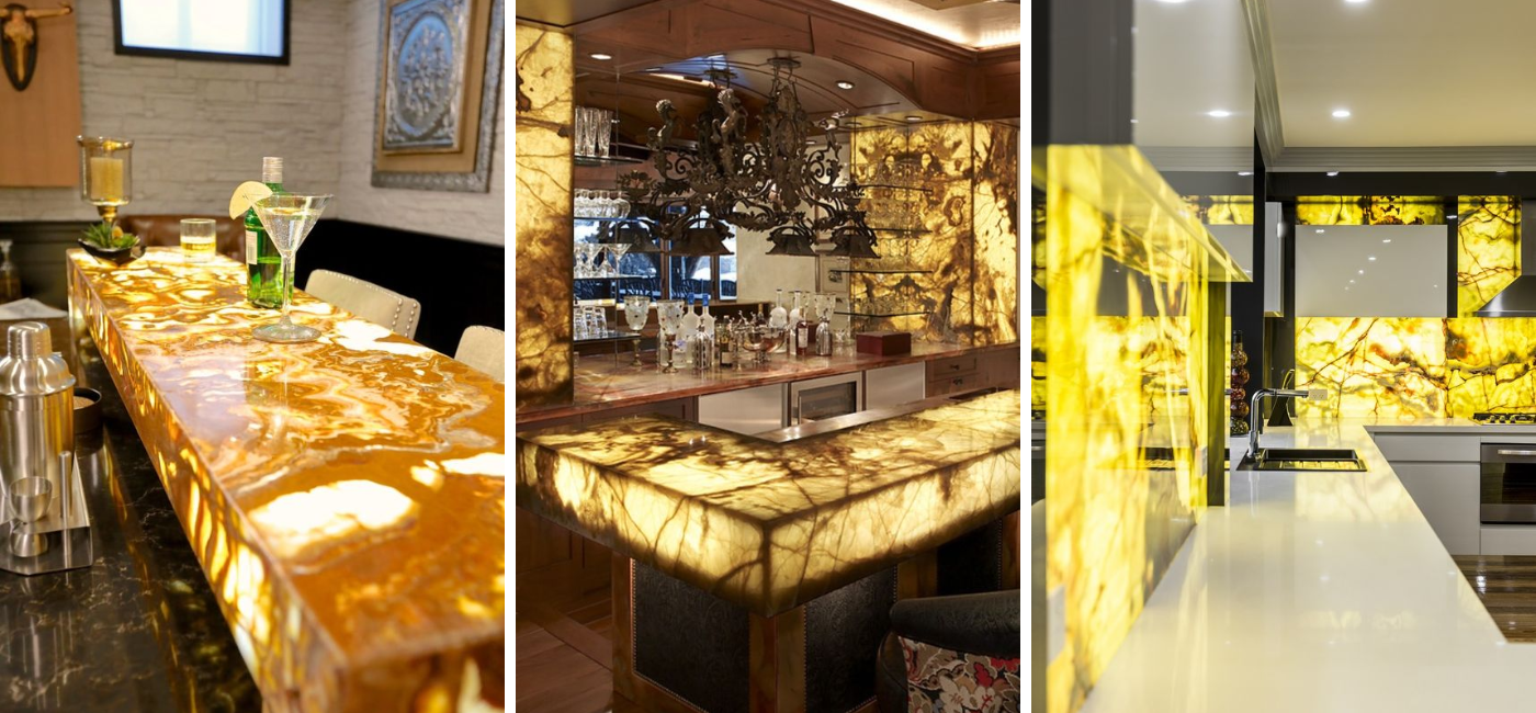 Onyx is celebrated for its translucent beauty and unique veining. It’s often used to create stunning backlit features that add a touch of magic to interiors.