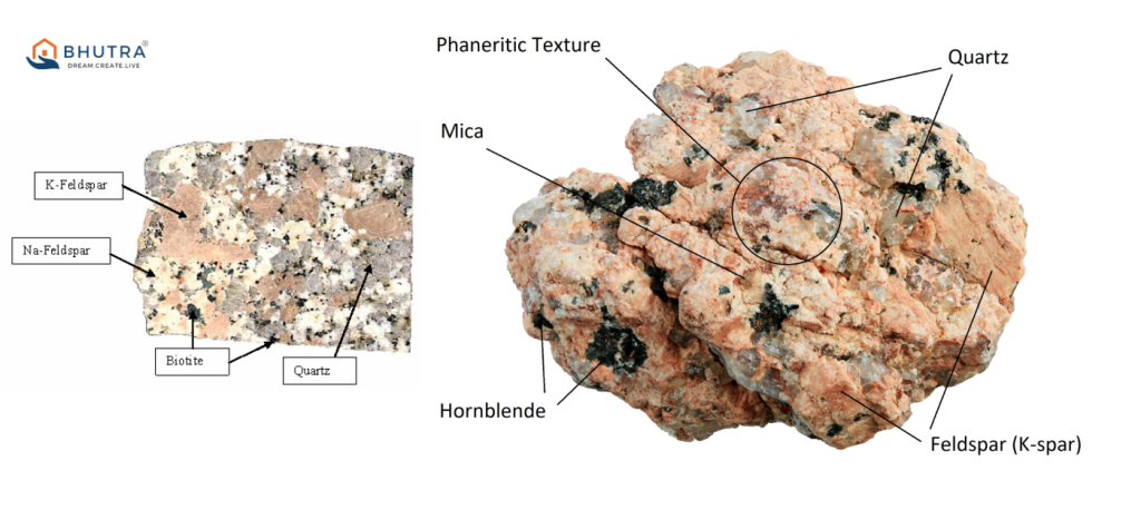 ग्रेनाइट पत्थर आग्नेय चट्टान है जो मुख्य रूप से क्वार्ट्ज, फेल्डस्पार, और माइका से मिलकर बनती है।