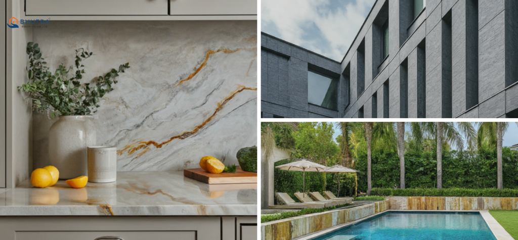 Quartz offers engineered durability and a wide range of design options, making it ideal for high-traffic areas such as countertops, facades, and pool surrounds.