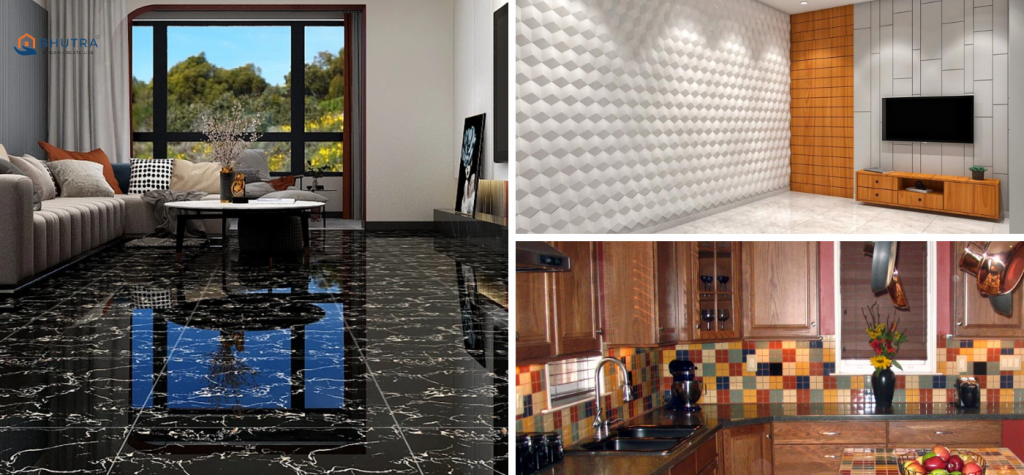 Flooring: Tiles are commonly used for flooring in areas such as kitchens, bathrooms, entryways, and living rooms. They come in a wide range of materials, colors, patterns, and sizes, allowing for endless design possibilities. Ceramic, porcelain, and vitrified tiles are popular choices for their durability and resistance to moisture, making them ideal for high-traffic areas.